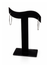 O produto apresenta acabamento em acrílico preto com formato em 'T', facilitando a colocação e a visualização dos brincos. Sua base sólida ajuda a evitar tombamentos, tornando-o uma peça funcional para uso pessoal ou em lojas.