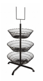 O produto inclui a estrutura giratória com 3 cestos metálicos pretos montados e prontos para uso.