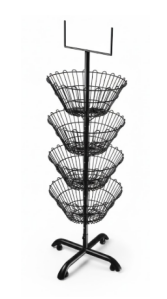 O cesto possui uma estrutura metálica em acabamento preto fosco, com 4 cestos em formato aramado que giram, proporcionando fácil visualização e acesso aos objetos armazenados. O suporte mantém os cestos firmes e permite organização versátil para alimentos, frutas, roupas ou acessórios em casa ou no comércio.