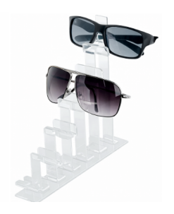 Produzido em acrílico transparente, o expositor possui estrutura estável que suporta o peso dos óculos sem tombar. Seu design simples garante destaque aos óculos, facilitando a escolha do cliente.