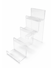Fabricado em acrílico resistente, permite o suporte seguro de bolsas clutch e carteiras. Suas dimensões proporcionam facilidade para acomodar diferentes tamanhos, mantendo a organização. A transparência do material confere leveza e modernidade ao ponto de venda.