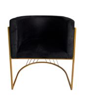 Feita com estrutura metálica dourada resistente, a poltrona traz estofado em veludo preto que oferece conforto e durabilidade. Seu design meia lua envolve o usuário, conferindo aconchego e suporte. Não possui medidas específicas detalhadas, mas seu formato compacto facilita a integração em diversos ambientes.